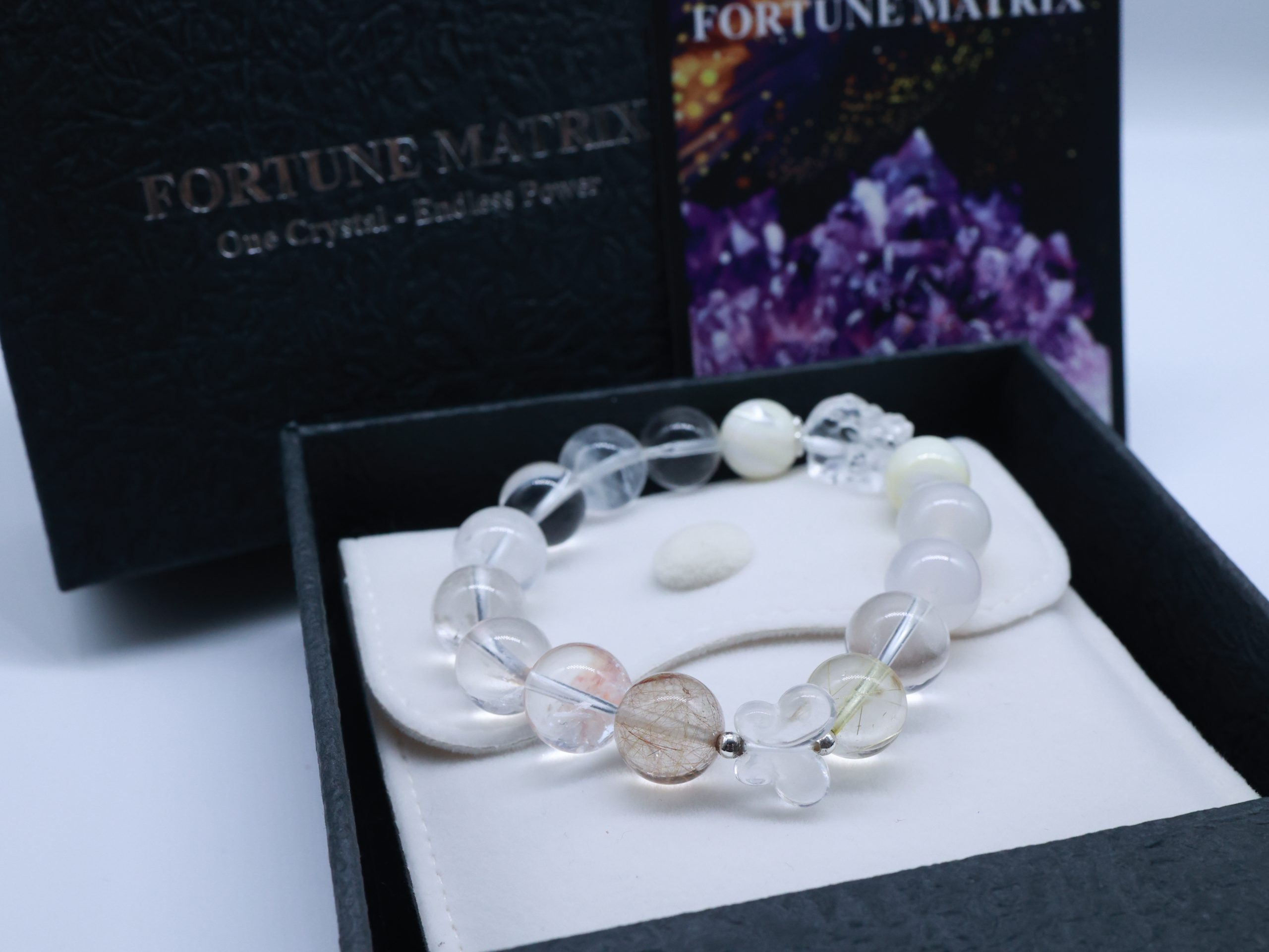 This bracelet combines a harmonious selection of gemstones and meaningful symbols, each chosen for its unique energy and beauty. Silver shell beads, with their gentle luster, embody purity and serenity. White agate brings balance and grounding, helping to steady emotions and clear the mind, while white aragonite encourages patience, peace, and emotional healing. Clear quartz, the renowned “Master Healer,” amplifies positive energy and intentions, enhanced by white phantom quartz, which supports spiritual growth and higher guidance. Venus golden rutilated quartz infuses the piece with abundance, confidence, and the ability to attract wealth and new opportunities. At its heart, a clear quartz Pixiu serves as a powerful Feng Shui talisman for prosperity and protection, while a delicate clear quartz butterfly symbolizes transformation, freedom, and the beauty of life’s journey. Finished with refined alloy accents, this bracelet blends durability with timeless elegance.