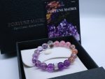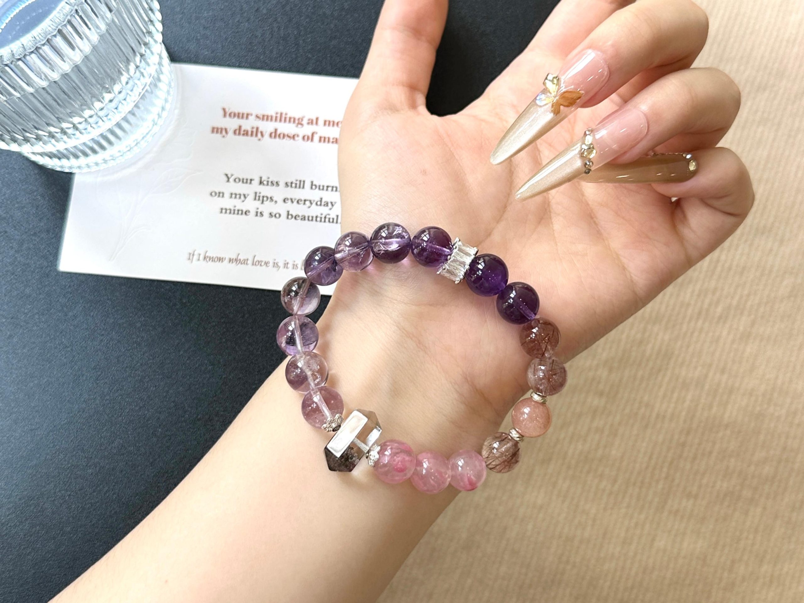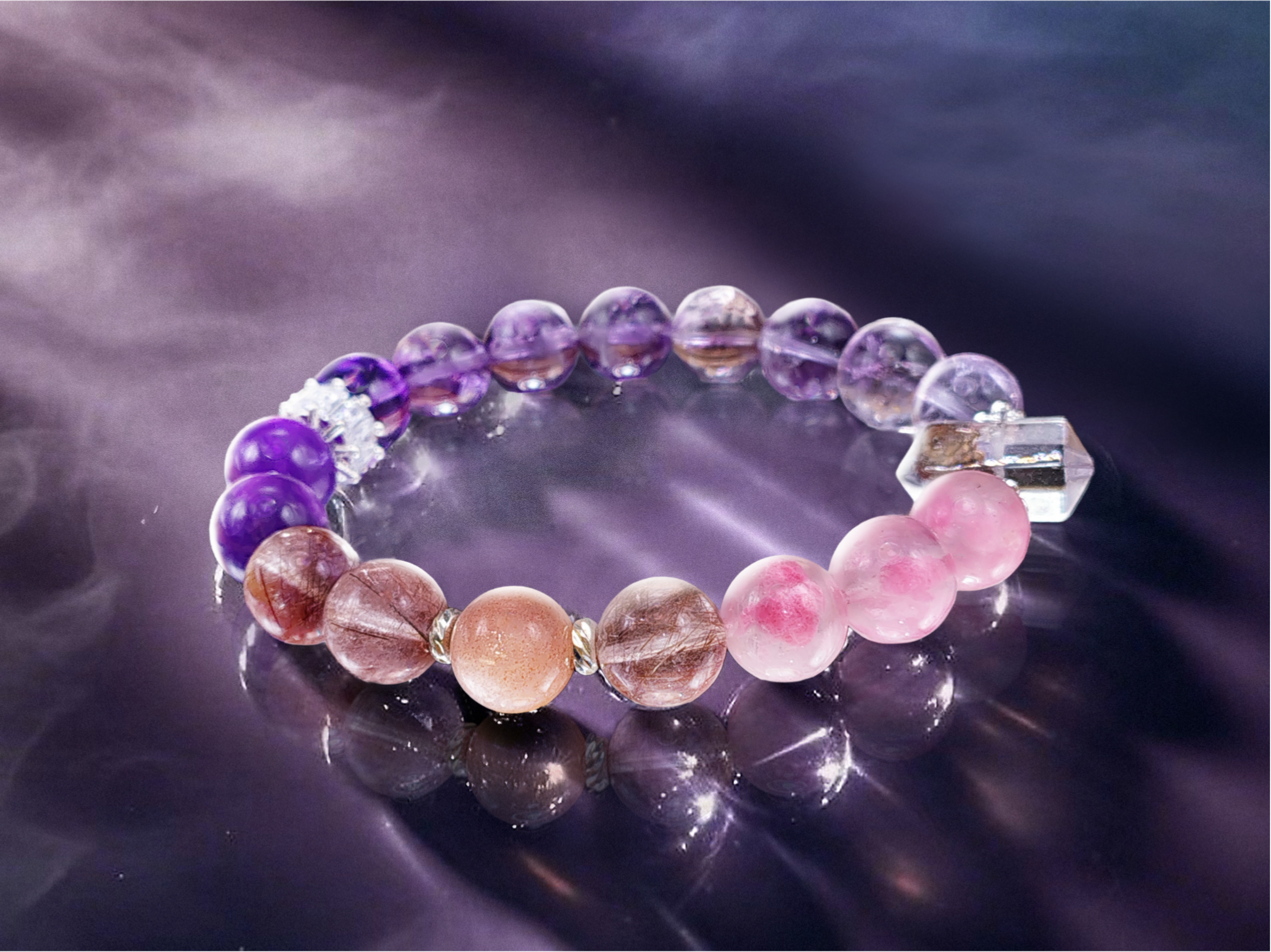 This bracelet is a symphony of fiery hues and energizing stones, each carefully chosen to awaken the spirit. Lavender amethyst radiates a calming yet empowering energy, balancing passion with clarity. Purple agate nurtures emotional stability while encouraging self-confidence. Brazilian amethyst deepens spiritual connection and focus, while red copper rutilated quartz infuses drive, determination, and a touch of protective grounding. Sunstone glows with golden warmth, sparking joy and leadership energy, and cherry blossom quartz softens the heart with love and optimism. At its center, a striking double-terminated red phantom quartz embodies transformation, amplifying energy flow in both directions to inspire powerful change. Finished with polished alloy accents, this piece blends the raw beauty of nature with refined craftsmanship.