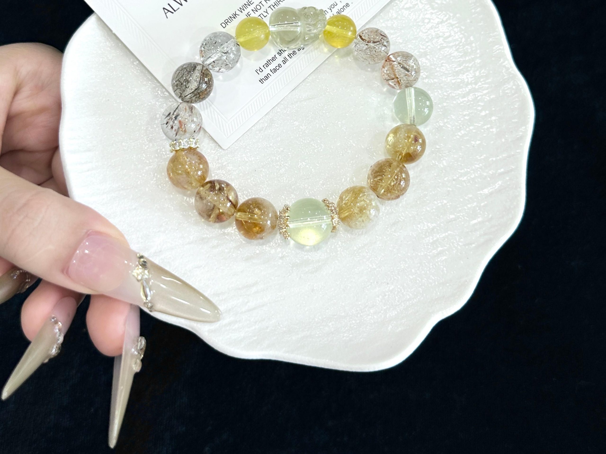 Radiating the golden warmth of the Earth element, this bracelet combines crystals that inspire both security and abundance. Yellow fluorite clears mental fog while fostering confidence and decisiveness. The centerpiece, a finely carved yellow citrine Pixiu, is a revered Feng Shui talisman for wealth and protection. Black gold super seven quartz offers profound grounding and spiritual insight, bridging material success with inner growth. Golden “tower” quartz enhances clarity and manifestation, while a single yellow citrine bead infuses joy, optimism, and the steady attraction of prosperity. Finished with polished alloy accents, the bracelet is both a powerful talisman and a timeless piece of jewelry.